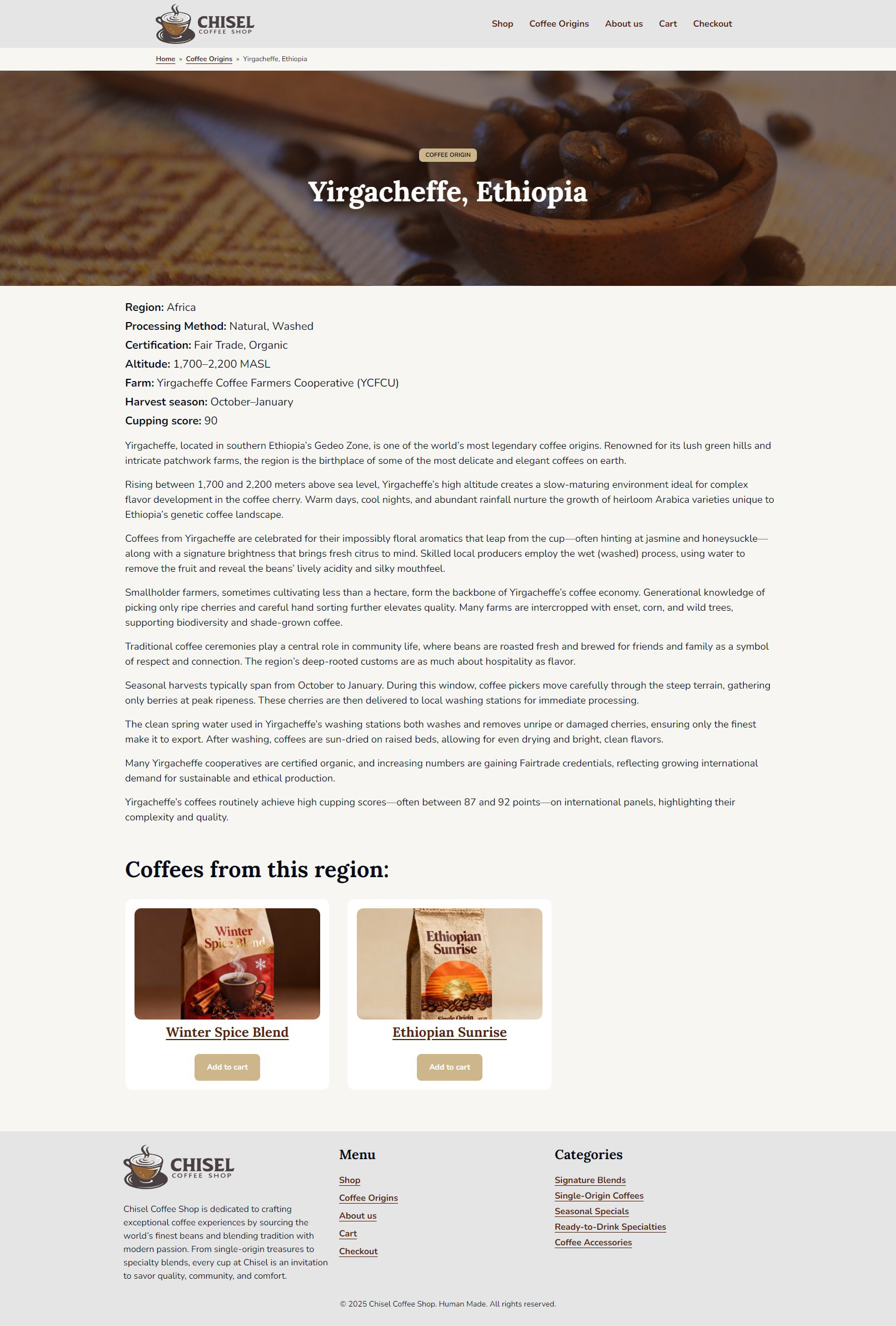 A custom taxonomy is a classification system you define to group your content. For example, on a specialized coffee site, you may want to categorize both Coffees Products and Coffee Origins by shared attributes such as region or processing method.