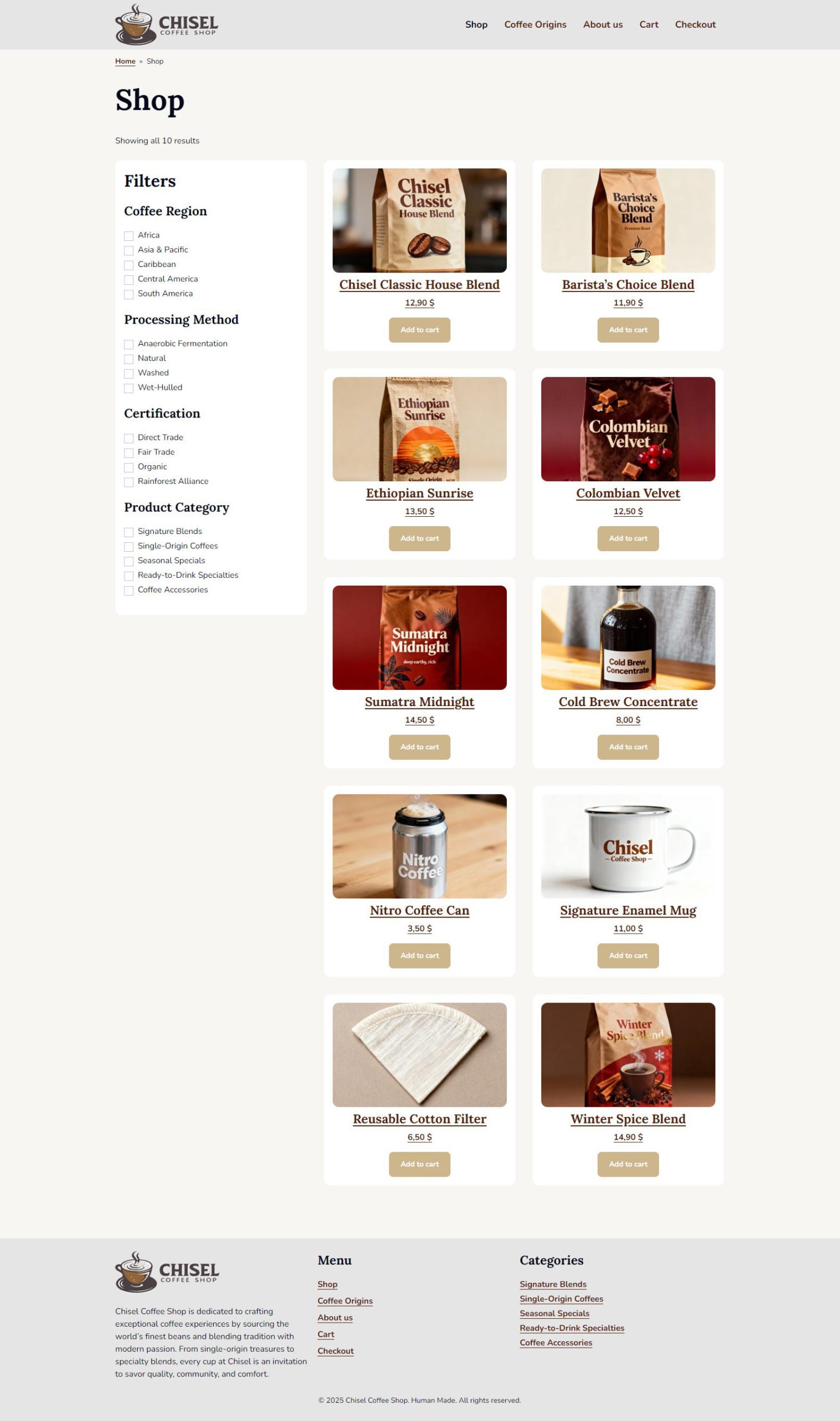 For our website we will use AJAX custom filters on Products and Coffee Origin archive pages. We will build the following filters: